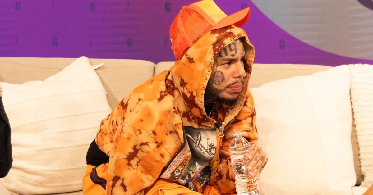 6ix9ine wearing an orange tie-dye hoodie and cap sits on a couch holding a water bottle, with face tattoos visible.
