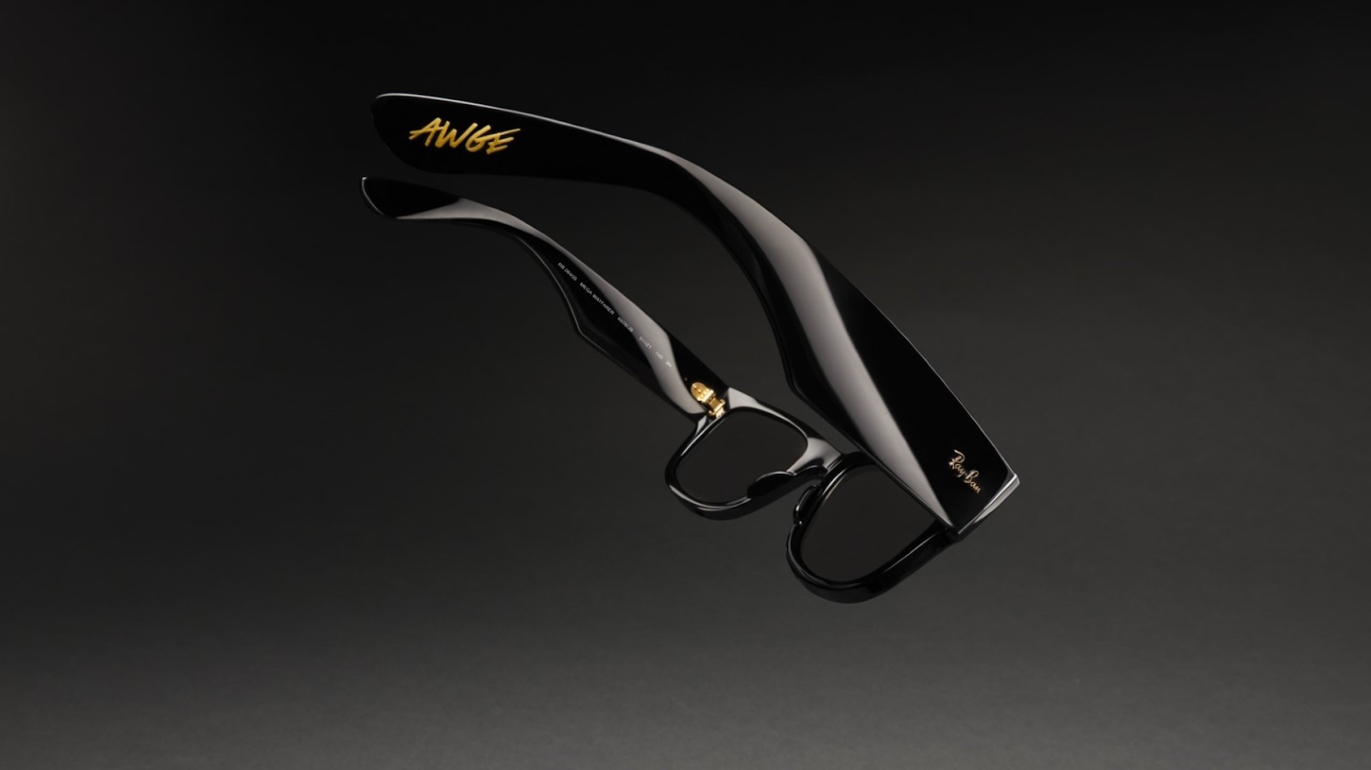 Sleek black sunglasses with "AWGE" and "Ray-Ban" logos in gold on the arms, set against a dark background.