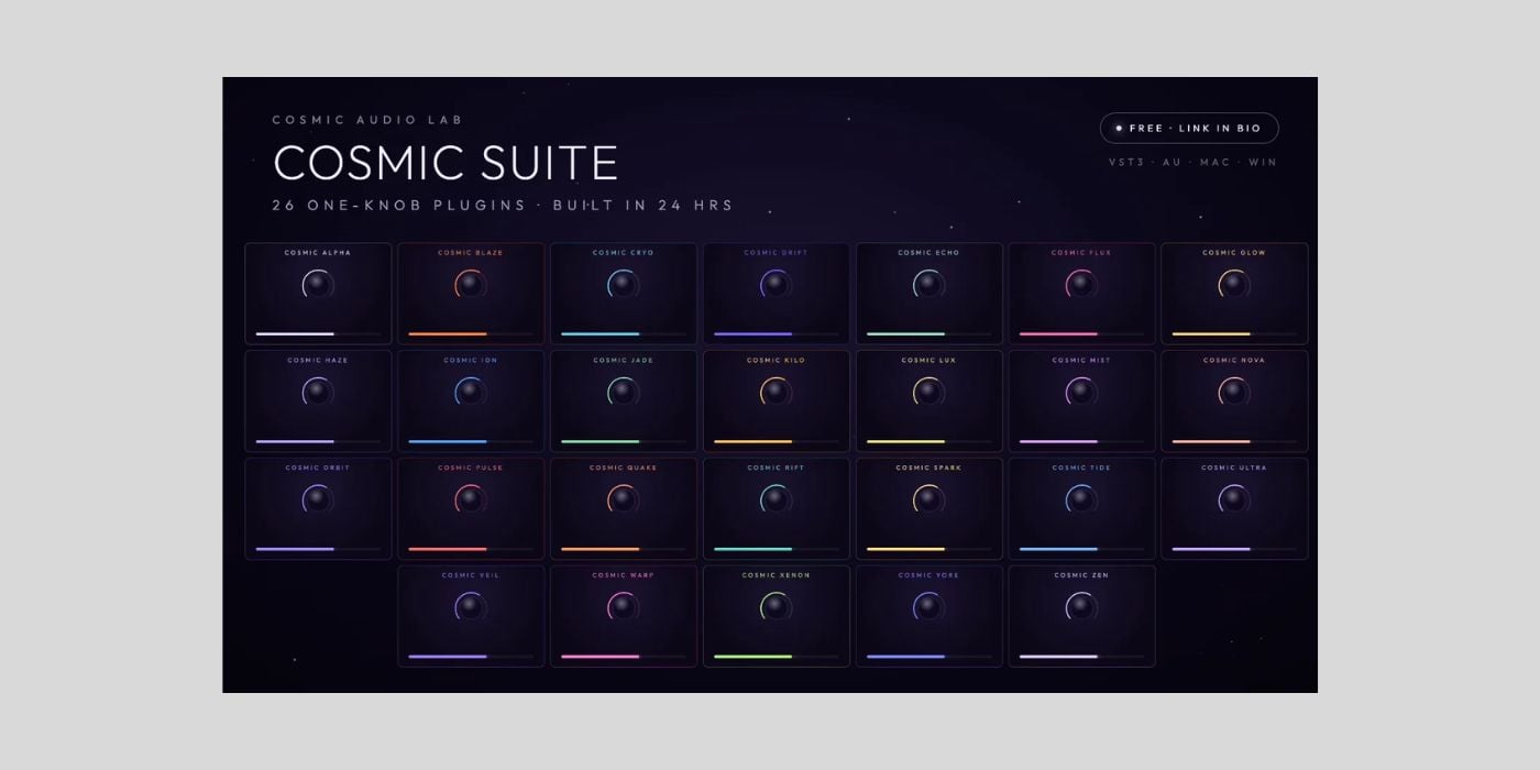Cosmic Suite by Cosmic Audio Lab is a collection of 26 one-knob plugins, available for free in AU and VST3 formats for macOS (11 or later) and Windows (11).
