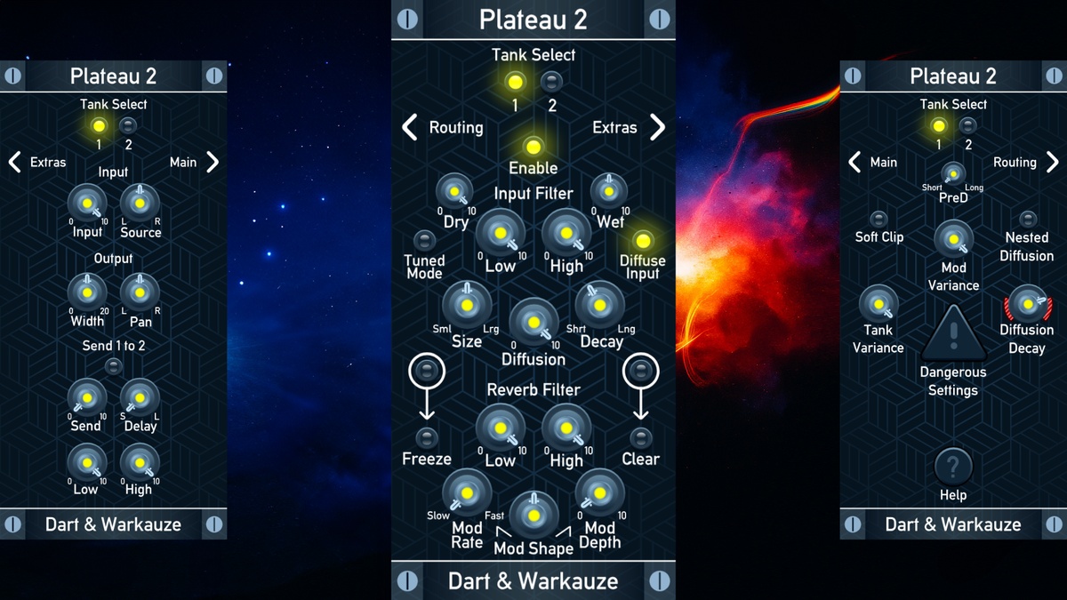 A standalone version of the open source VCV Rack module, Plateau 2 Plate Reverb features two reverb instances called tanks which can interact with sends between tanks to create rich highly customizable and spacious reverb effects.