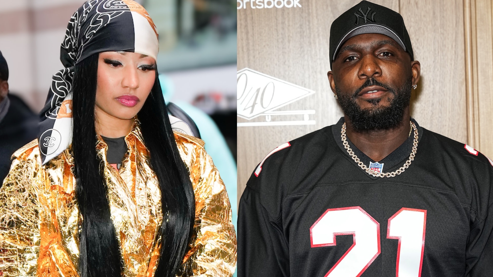 (L) Nicki Minaj in a gold jacket and headscarf. (R) Dez Bryant in a black sports jersey and cap.