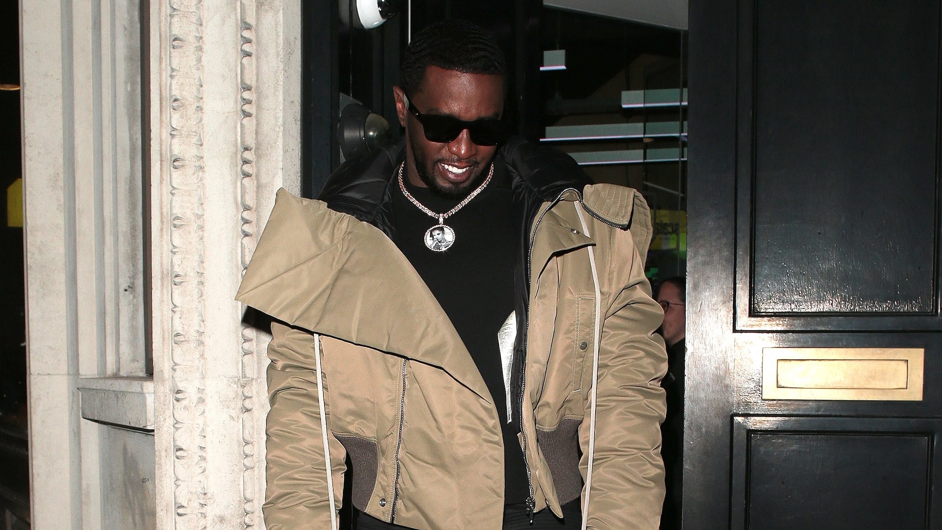 Sean "Diddy" Combs wearing sunglasses and a beige jacket, smiling as he exits a building.