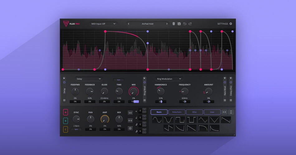 The Flux Pro plugin features 3 customizable graphs to sculpt your sound. It includes 10 different effects in 4 effects slots, and 48 drag-able shapes for fast and effective rhythmic sketches.