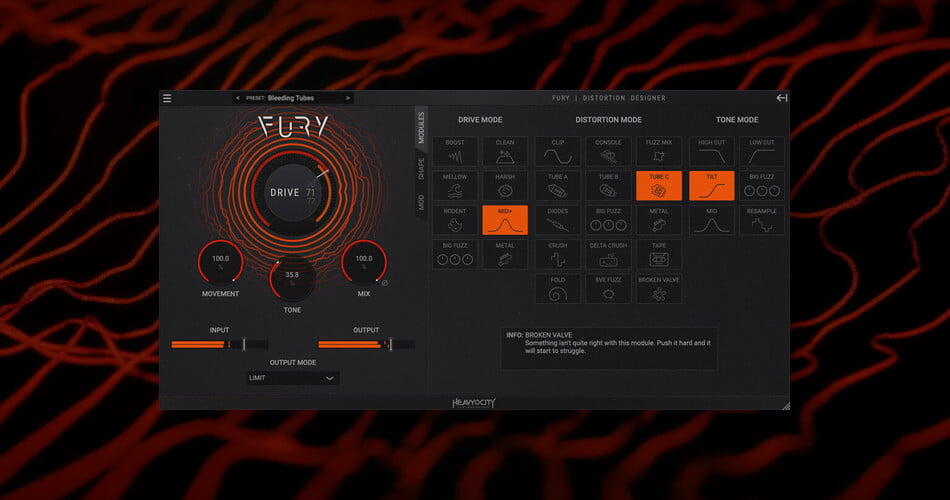 At its core, FURY is a semi-modular distortion designer. The main part of the distortion effect has three distinct sections — DRIVE, DISTORTION, and TONE — within each of these sections there are several modules allowing you to mix and match, altering the behavior of each, as you see fit. In fact, there are over 700 possible module combinations and over 100 custom-made presets for you to explore.