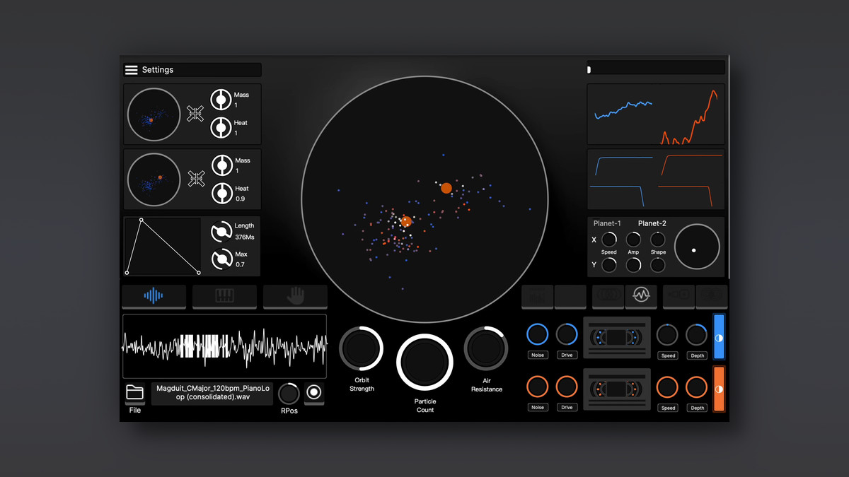 As particles move and interact within the virtual space, their position, velocity, and behavior continuously modulate the granular parameters, giving you an entirely new approach to sound design.