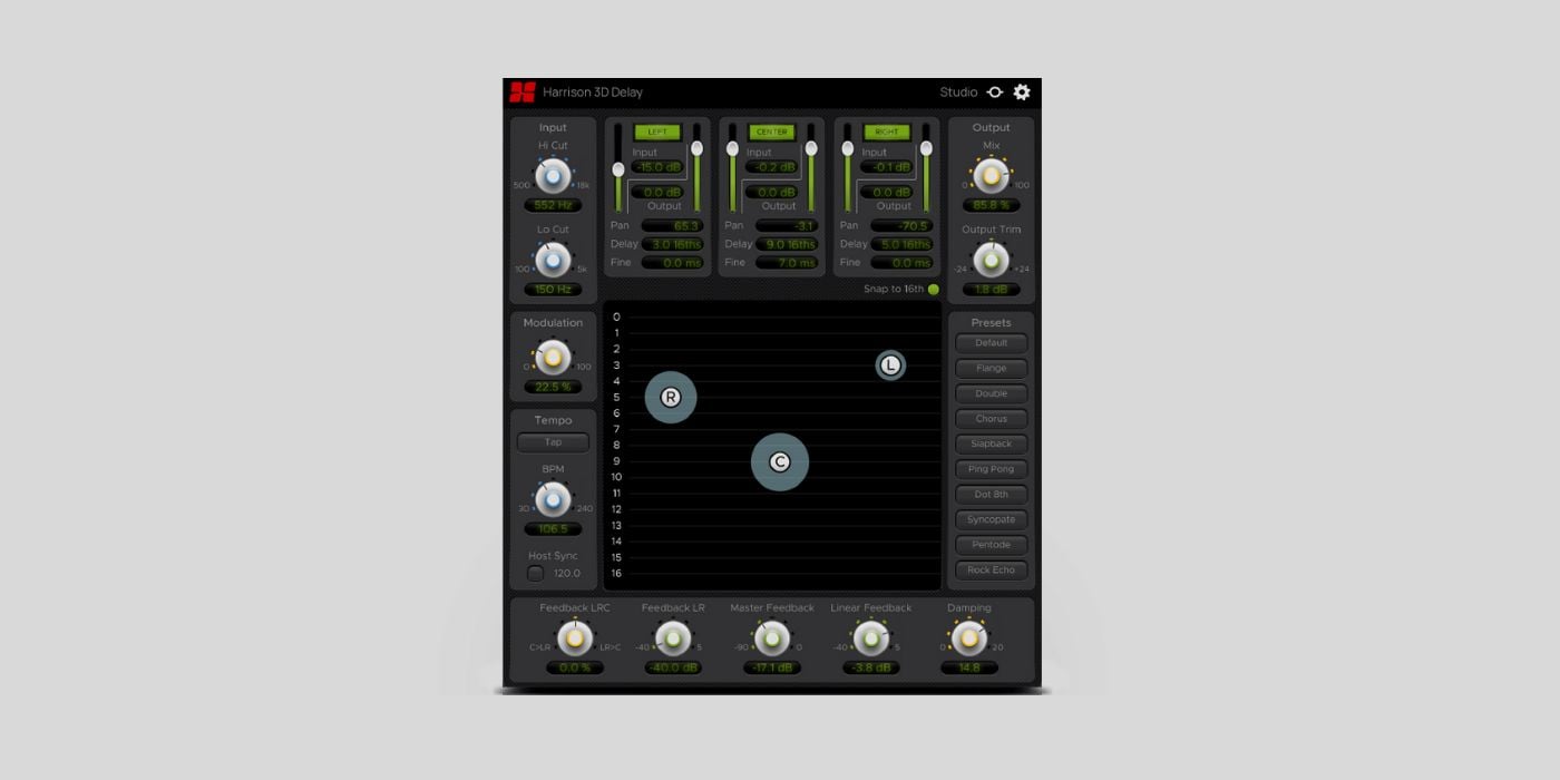 The plugin might look a little familiar to Harrison Audio fans because, while it’s a new release, it’s not an entirely new concept. Harrison Audio released the 3D Triple Delay plugin over a decade ago, and you’ll find many similarities in this latest version.