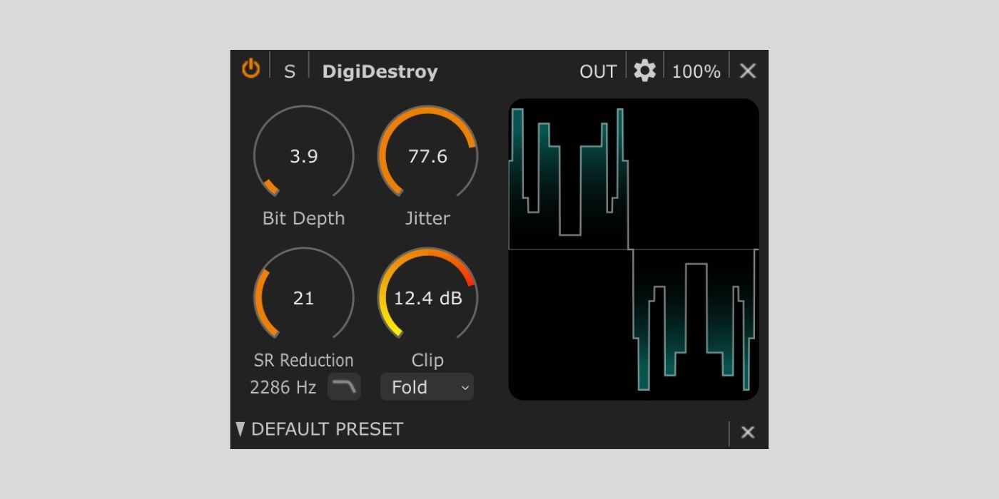 In the free version, DigiDestroy offers adjustable bit depth (from 3 to 16-bit) and sample rate reduction (SRR up to 65 steps), letting you introduce anything from light digital dirt to extreme degradation.