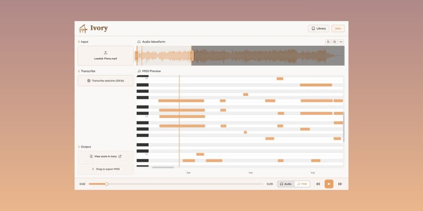 Ivory supports MP3, WAV, MP4, and MIDI files up to 15MB, and the output can be exported as MIDI, MusicXML, or PDF, depending on whether you want to continue working in a DAW or move over to notation software.