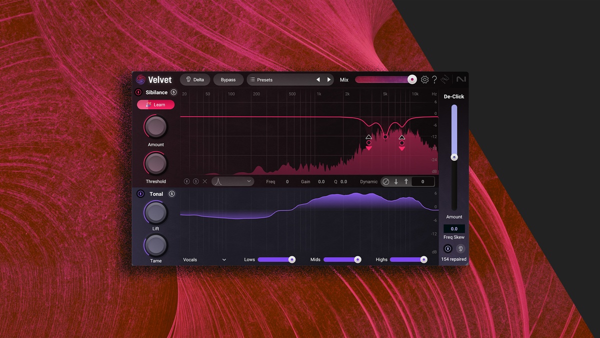 Unlike traditional de-essers that can often dull the overall character of a vocal, Velvet’s dedicated sibilance and tonal channels allow for transparent and targeted processing of any problematic parts, preserving the natural warmth and clarity of your vocals.