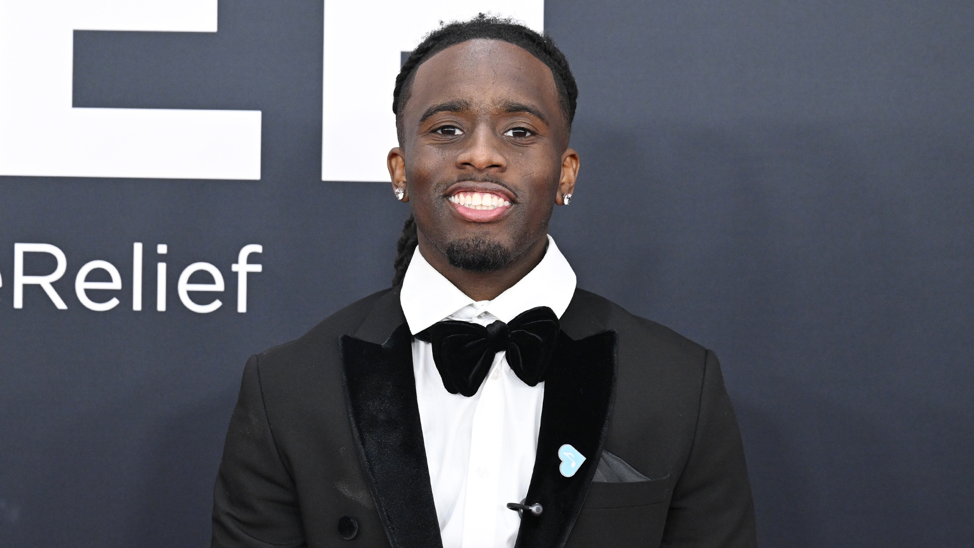 A man in a tuxedo with a bow tie smiles at an event, standing against a dark background with text partially visible.