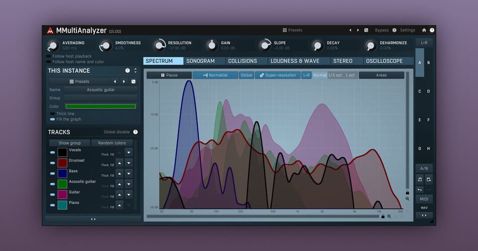MMultiAnalyzer is a unique multi-track spectrum, loudness and stereo analyzer and sonogram, which reveals problems and frequency collisions quickly, easily, and with astonishing accuracy.