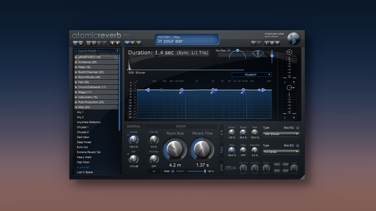When I had the chance to review AtomicReverb 2, I jumped at it—despite having no prior experience with their products. What sets this reverb apart is its unique approach; it doesn’t rely on convolution or static IR data, nor does it emphasize traditional reverb tails. Instead, the focus is on early reflections and mid-range perception. By continuously analyzing and adjusting reverberation, AtomicReverb ensures a natural sound while eliminating unwanted resonances.