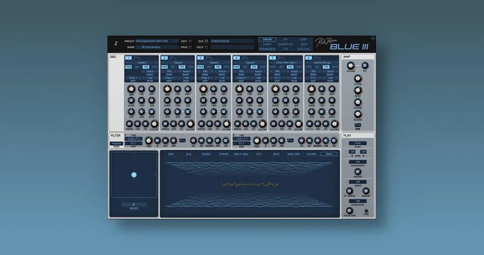 The concept for BLUE-III still remains true to that ethos with even more added sound dimensions and features to its extended name. Firstly adding their own take on ‘Karplus Strong String Model Synthesis’, new ‘Waveforms’, new ‘Filter types’, a new range of creative ‘built-in Samples’, and lastly the option for you as a user to load up to 6 samples inside each Preset.