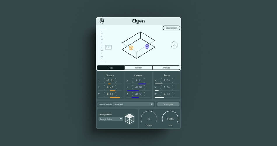 These three modes are able to perform a selection of different “space-aware” processes; Play does accurate early reflection processing in real-time, Render computes high-quality reverb impulse responses for you to use in convolution reverbs (or in Eigen itself, if you want), and Analyse checks your virtual space to see how sound resonates against it.