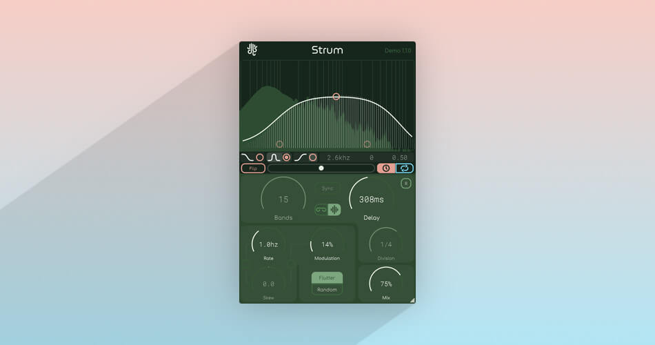 Additionally, Strum provides a modulation panel for a bit more control of the delay times, allowing you to switch between “flutter” and “random” modes.