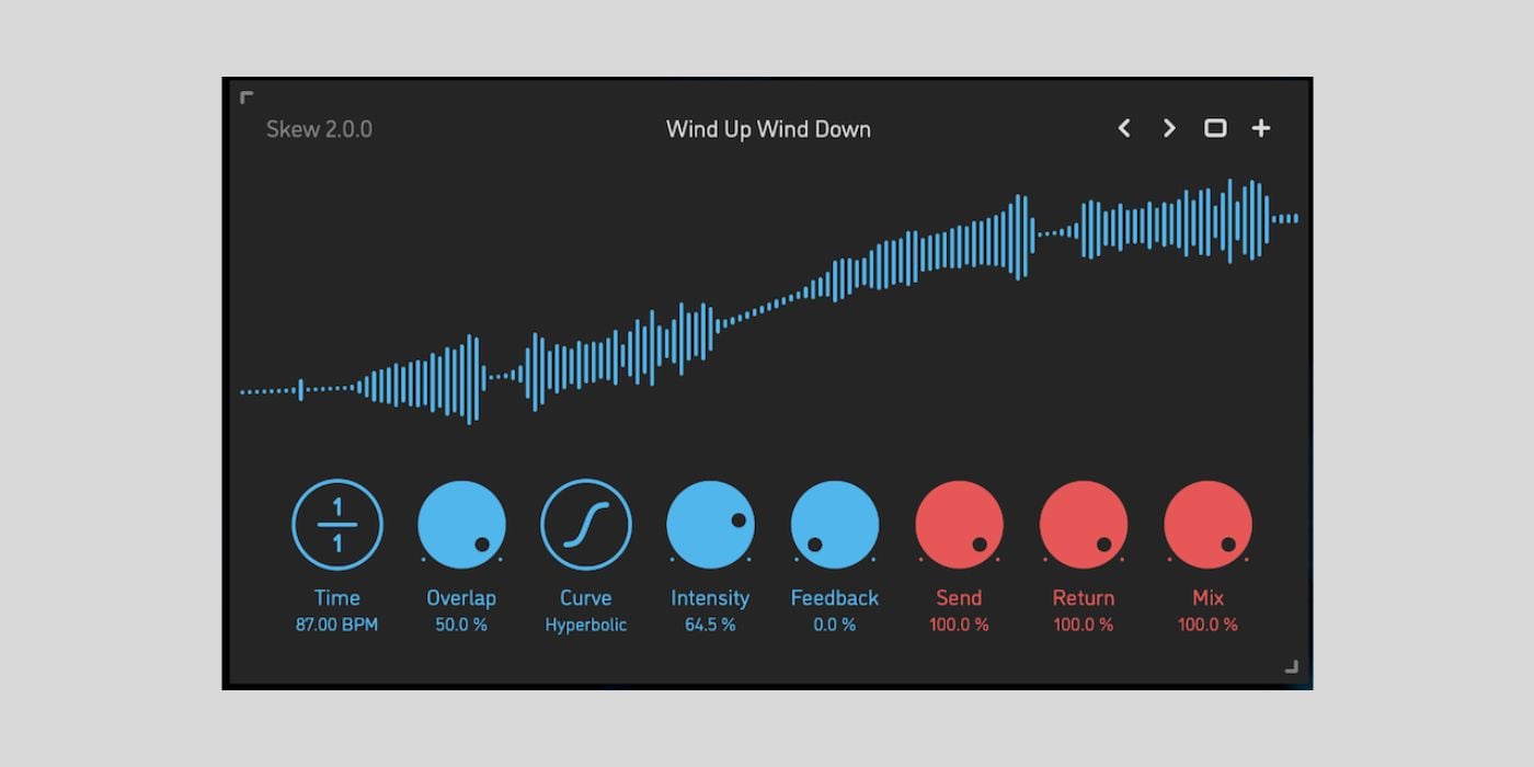 Skew offers twelve non-linear curves that warp and mangle the delay playback speed in various ways, creating interesting pitch movements.