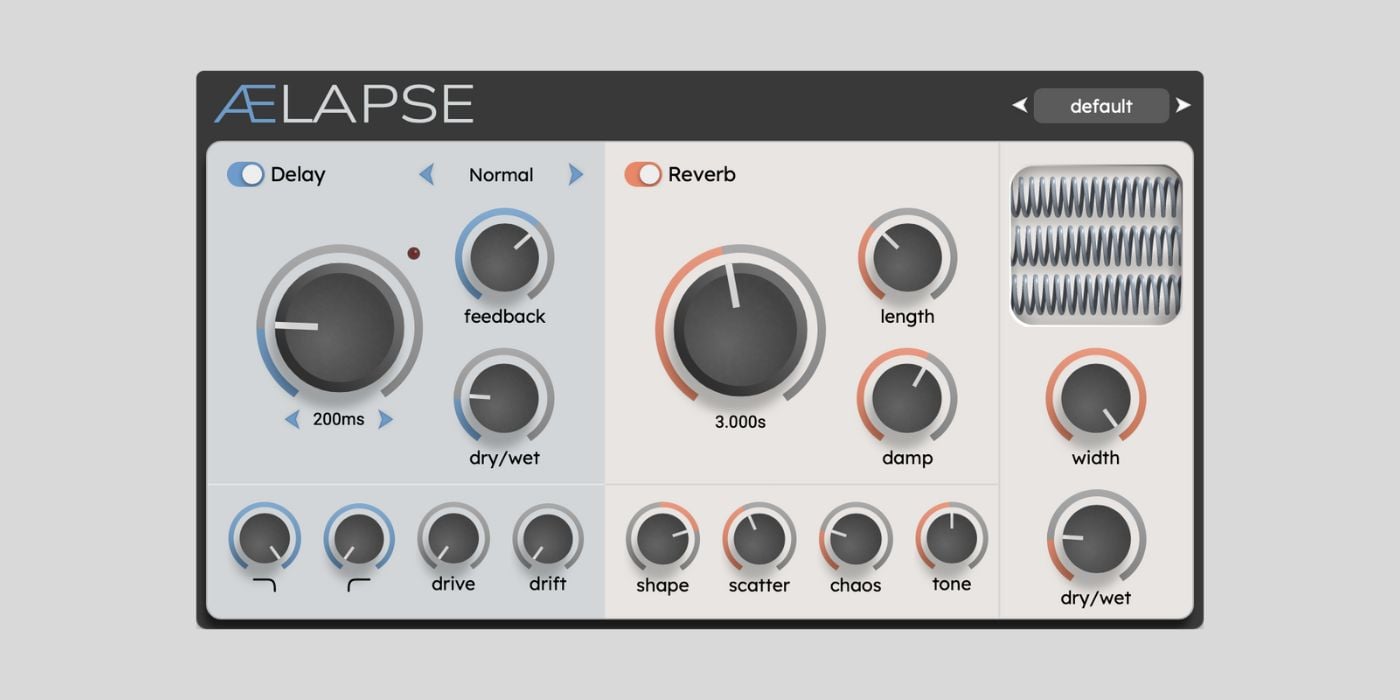 ÆLAPSE combines two classic effects in a single plugin: a tape-style delay and a reverb inspired by spring reverbs.