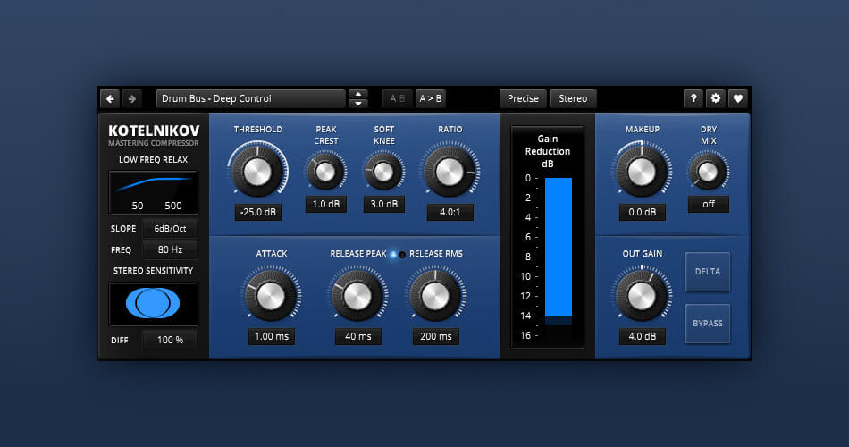As a descendant of the venerable TDR Feedback Compressor product family, Kotelnikov has directly inherited several unique features such as a proven control scheme, individual release control for peak and RMS content, an intuitive user interface, and powerful, state of the art, high-precision algorithms.