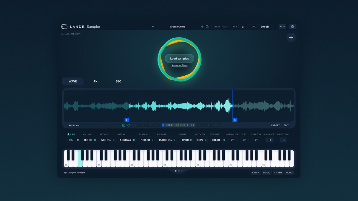 Tuned on over 3 million LANDR samples and powered by MonkeyC, LANDR Sampler delivers fast, intelligent performance. It’s optimized to understand and organize your personal sample stash—making everything instantly playable and creatively inspiring.