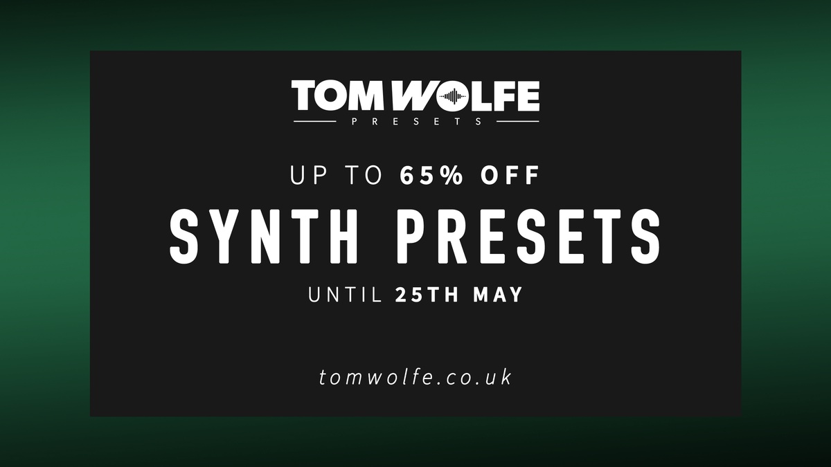 Nearly all Tom Wolfe Presets soundbanks are included in the sale, with up to 65% off across products for Spectrasonics Omnisphere, Arturia Pigments, u-he Diva and more.