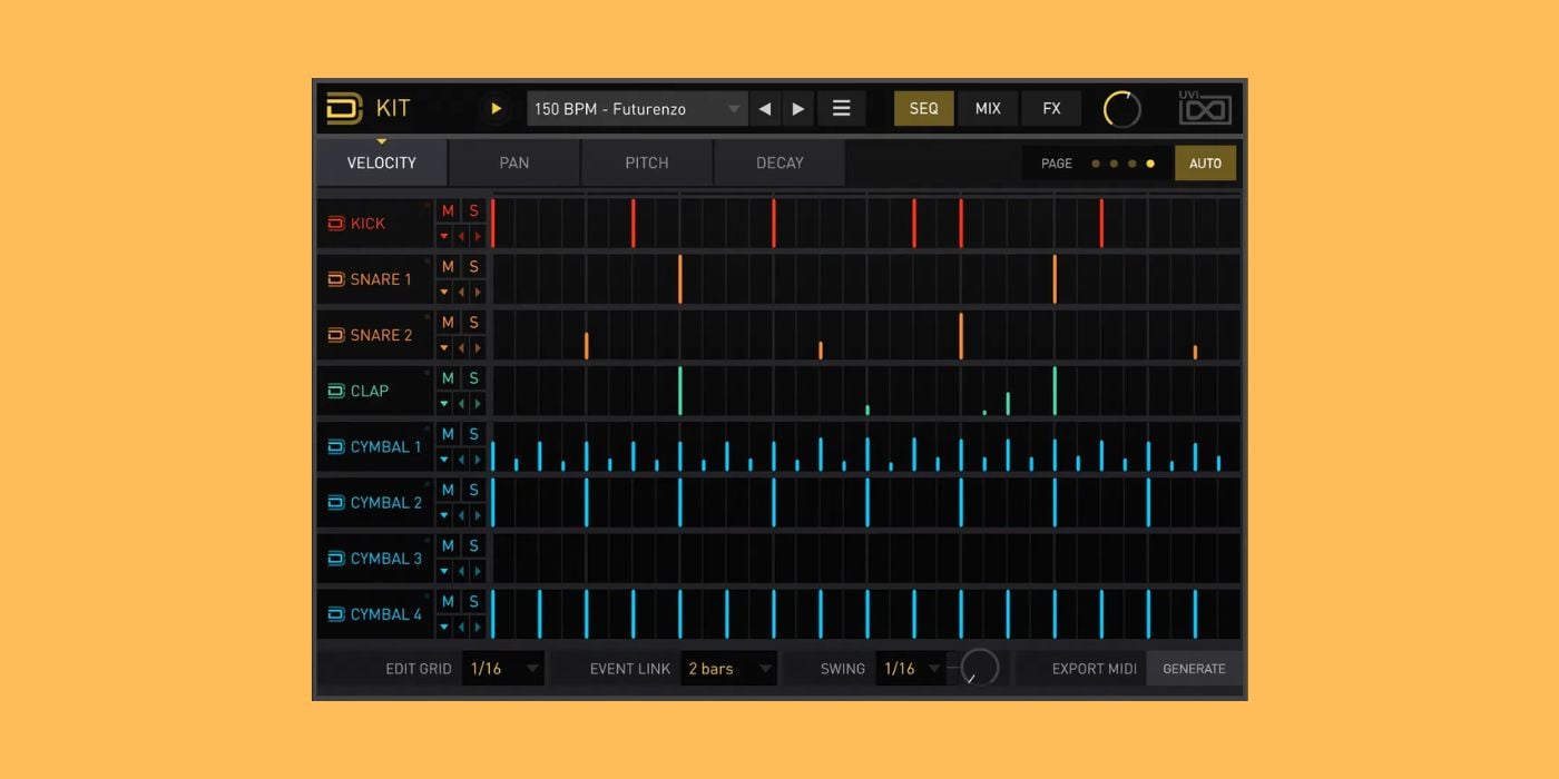 The sequencer runs up to 8 bars at resolutions up to 1/64t, with per-part control over Velocity, Pan, Pitch, and Decay. You can also drag and drop sequences directly into your DAW as MIDI. The Kit FX page adds a bus Compressor, Post Clip, EQ, Delay, and Reverb, and a multi-output version is available if you want to route each part to its own channel.