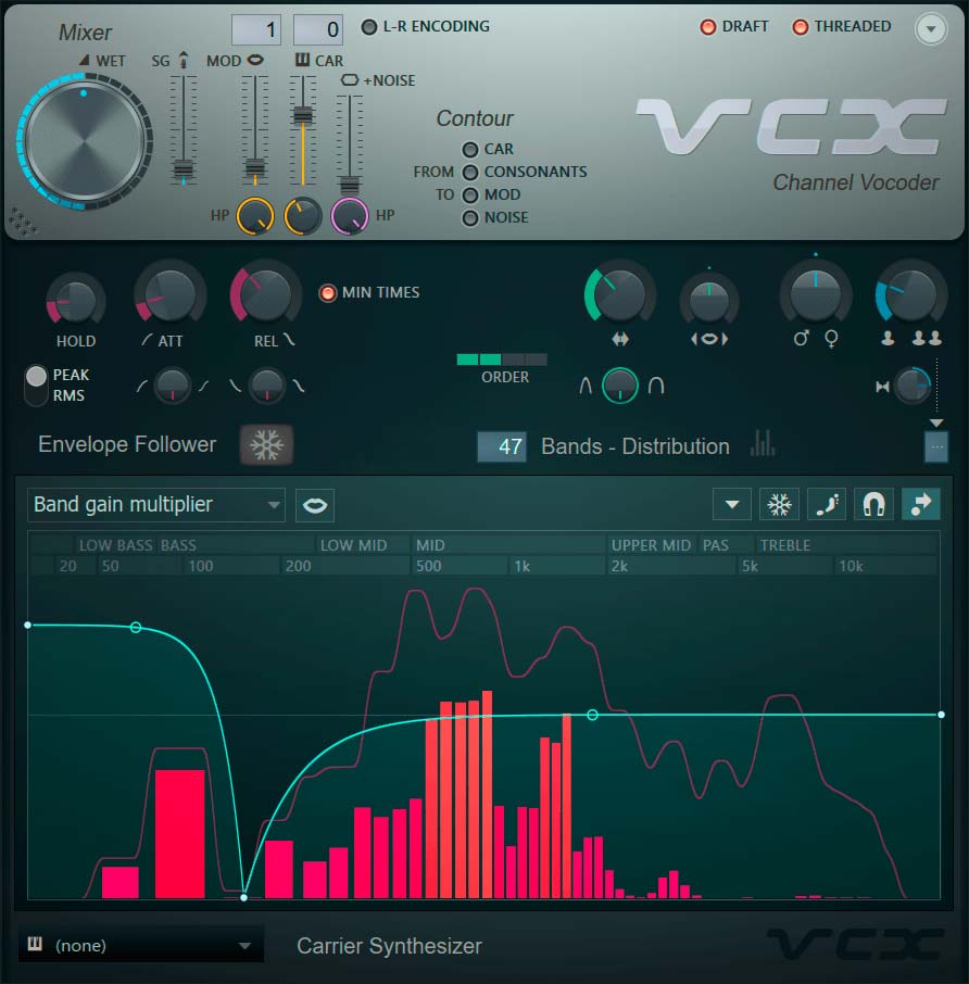 Bands – On all software vocoders you can select the number of frequency bands to affect the sound. Generally, the lower the number of bands – the more robotic the sound and visa-versa the high number – the more natural sounding.