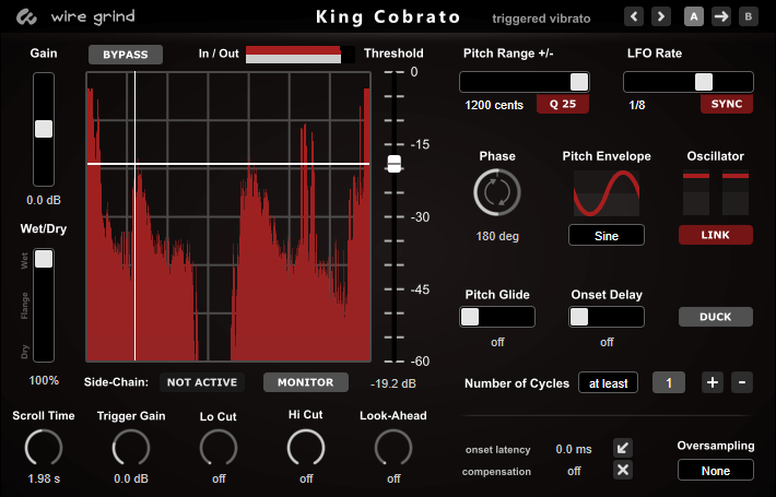 King Cobrato comes with a variety of pitch envelopes, ducking, internal/external sidechaining, and settings to limit/force LFO cycling. The plugin can also be used as a chorus or flange effect.